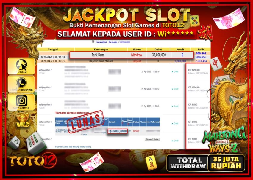 Selamat kepada Member Kami Wi***** Telah Jackpot dan berhasil mendapatkan kemenangan besar pada permainan JACKPOT SLOT GAME (MAHJONG WAYS 2) Dengan Kemenangan Sebesar Rp.35.000.000–.