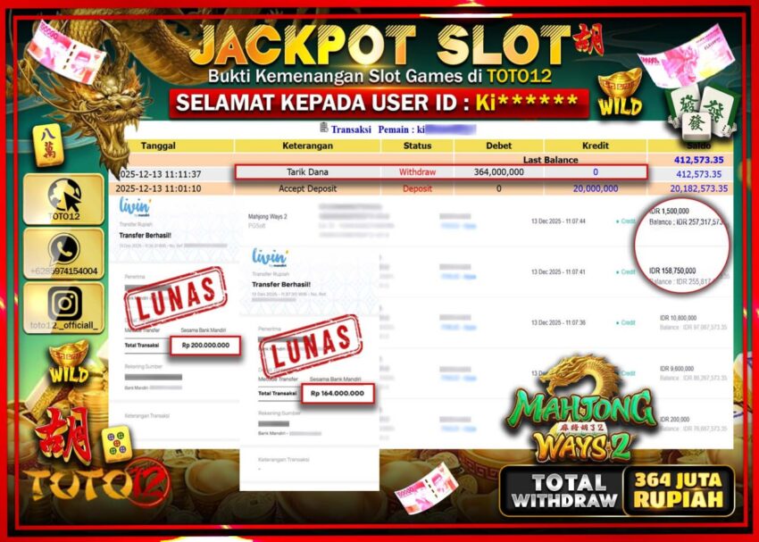 Selamat kepada Member Kami Ki****** Telah Jackpot dan berhasil mendapatkan kemenangan besar pada permainan JACKPOT SLOT GAME (MAHJONG WAYS 2) Dengan Kemenangan Sebesar Rp.364.000.000 –.