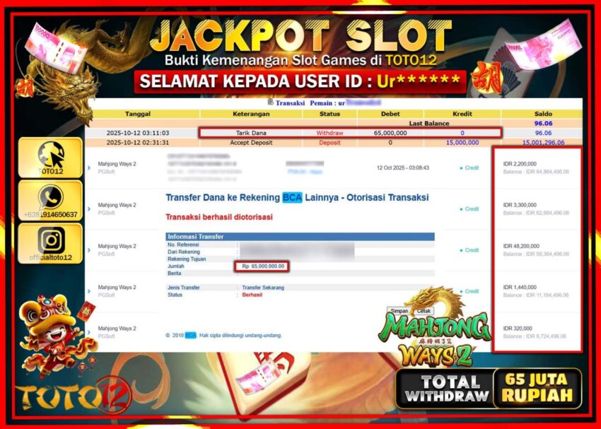 Selamat kepada Member Kami Ur****** Telah Jackpot dan berhasil mendapatkan kemenangan besar pada permainan JACKPOT SLOT GAME (MAHJONG WAYS 2) Dengan Kemenangan Sebesar Rp.65.000.000 –. Setelah mengisi Fomulir Withdraw dengan Kurang waktu 1-2 Menit Dana sudah kami Trasnfer kepada Pemilik Userid dan dana sudah dapat di cairkan oleh pemenang. Bukti Pembayaran yang TOTO12 berikan merupakan Bukti Pembayaran yang SAH / VALID yang langsung Di dapatkan melalui transaksi dari Bank yang di Tunju.