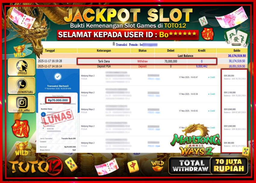 Selamat kepada Member Kami Bo****** Telah Jackpot dan berhasil mendapatkan kemenangan besar pada permainan JACKPOT SLOT GAME (MAHJONG WAYS 2)  Dengan Kemenangan Sebesar Rp.70.000.000 –.  Setelah mengisi Fomulir Withdraw dengan Kurang waktu 1-2 Menit Dana sudah kami Trasnfer kepada Pemilik Userid dan dana sudah dapat di cairkan oleh pemenang. Bukti Pembayaran yang TOTO12 berikan merupakan Bukti Pembayaran yang  SAH / VALID yang langsung Di dapatkan melalui transaksi dari Bank yang di Tunju.