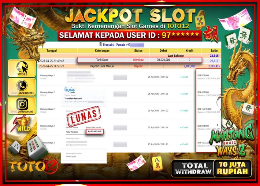 HANYA DI TOTO12 JP PASTI DI BAYAR LUNAS DAN CEPAT!!!!!! JACKPOT SLOT GAME (MAHJONG WAYS 2) Rp.70.020.000!!!!