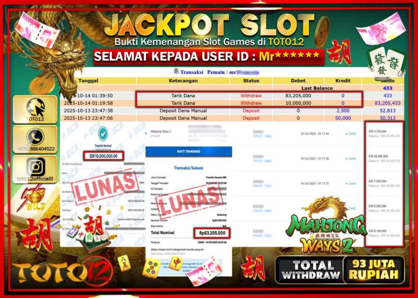 Selamat kepada Member Kami Mr****** Telah Jackpot dan berhasil mendapatkan kemenangan besar pada permainan JACKPOT SLOT GAME (MAHJONG WAYS 2) Dengan Kemenangan Sebesar Rp.83.205.000 –. Setelah mengisi Fomulir Withdraw dengan Kurang waktu 1-2 Menit Dana sudah kami Trasnfer kepada Pemilik Userid dan dana sudah dapat di cairkan oleh pemenang. Bukti Pembayaran yang TOTO12 berikan merupakan Bukti Pembayaran yang SAH / VALID yang langsung Di dapatkan melalui transaksi dari Bank yang di Tunju.