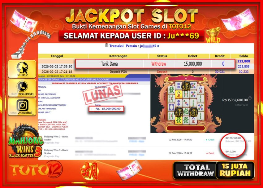 Selamat kepada Member Kami Ju****** Telah Jackpot dan berhasil mendapatkan kemenangan besar pada permainan JACKPOT SLOT GAME (MAHJONG WAYS 3 BLACK SCATTER  Dengan Kemenangan Sebesar Rp.15.000.000 –.