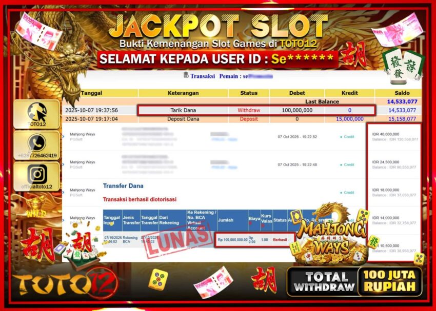 Selamat kepada Member Kami Se****** Telah Jackpot dan berhasil mendapatkan kemenangan besar pada permainan JACKPOT SLOT GAME (MAHJONG WAYS) Dengan Kemenangan Sebesar Rp.100.000.000 –. Setelah mengisi Fomulir Withdraw dengan Kurang waktu 1-2 Menit Dana sudah kami Trasnfer kepada Pemilik Userid dan dana sudah dapat di cairkan oleh pemenang. Bukti Pembayaran yang TOTO12 berikan merupakan Bukti Pembayaran yang SAH / VALID yang langsung Di dapatkan melalui transaksi dari Bank yang di Tunju.