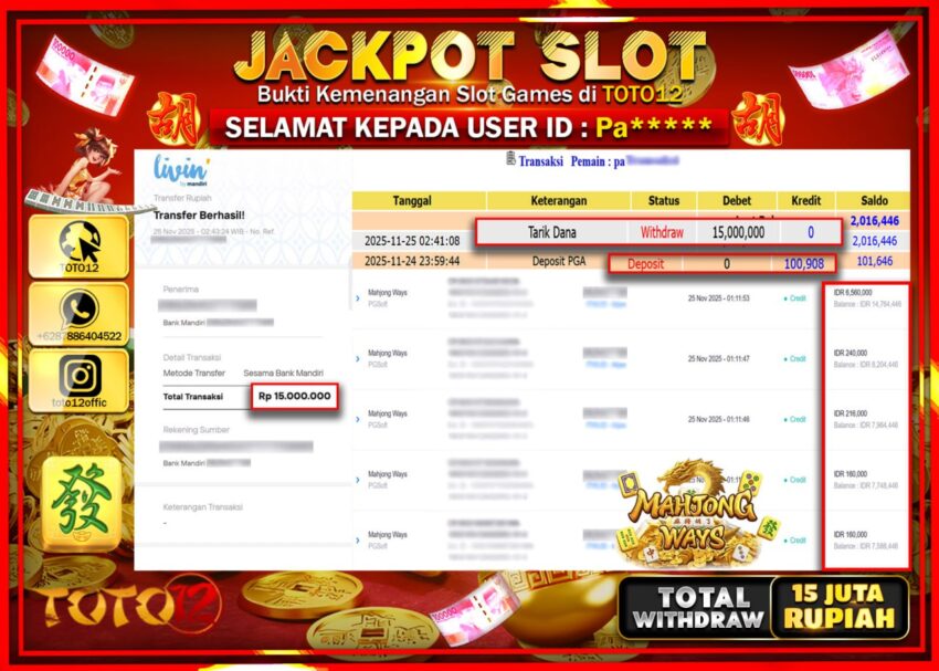 HANYA DI TOTO12 JP PASTI DI BAYAR LUNAS DAN CEPAT!!!!!! JACKPOT SLOT GAME (MAHJONG WAYS) Rp.15.000.000 !!!!