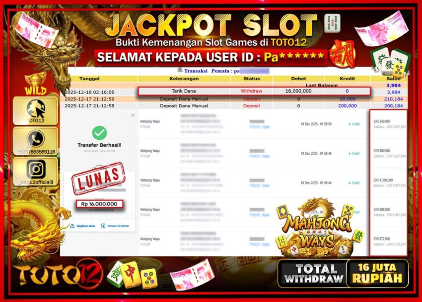 Selamat kepada Member Kami Pa****** Telah Jackpot dan berhasil mendapatkan kemenangan besar pada permainan JACKPOT SLOT GAME (MAHJONG WAYS) Dengan Kemenangan Sebesar Rp.16.000.000 –.