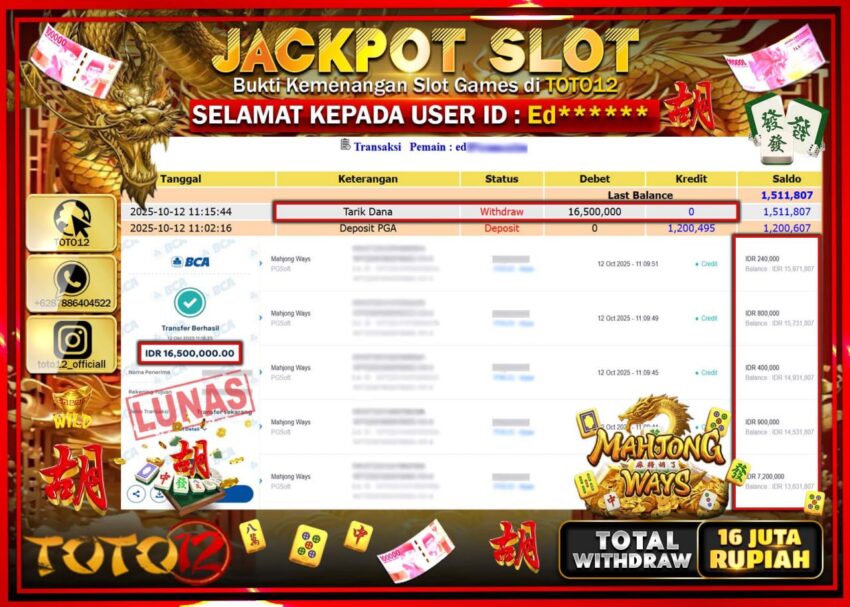 Selamat kepada Member Kami Ed****** Telah Jackpot dan berhasil mendapatkan kemenangan besar pada permainan JACKPOT SLOT GAME (MAHJONG WAYS) Dengan Kemenangan Sebesar Rp.16.500.000 –. Setelah mengisi Fomulir Withdraw dengan Kurang waktu 1-2 Menit Dana sudah kami Trasnfer kepada Pemilik Userid dan dana sudah dapat di cairkan oleh pemenang. Bukti Pembayaran yang TOTO12 berikan merupakan Bukti Pembayaran yang SAH / VALID yang langsung Di dapatkan melalui transaksi dari Bank yang di Tunju.