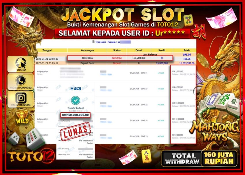Selamat kepada Member Kami Ur****** Telah Jackpot dan berhasil mendapatkan kemenangan besar pada permainan JACKPOT SLOT GAME (MAHJONG WAYS) Dengan Kemenangan Sebesar Rp.160.200.000 –.
