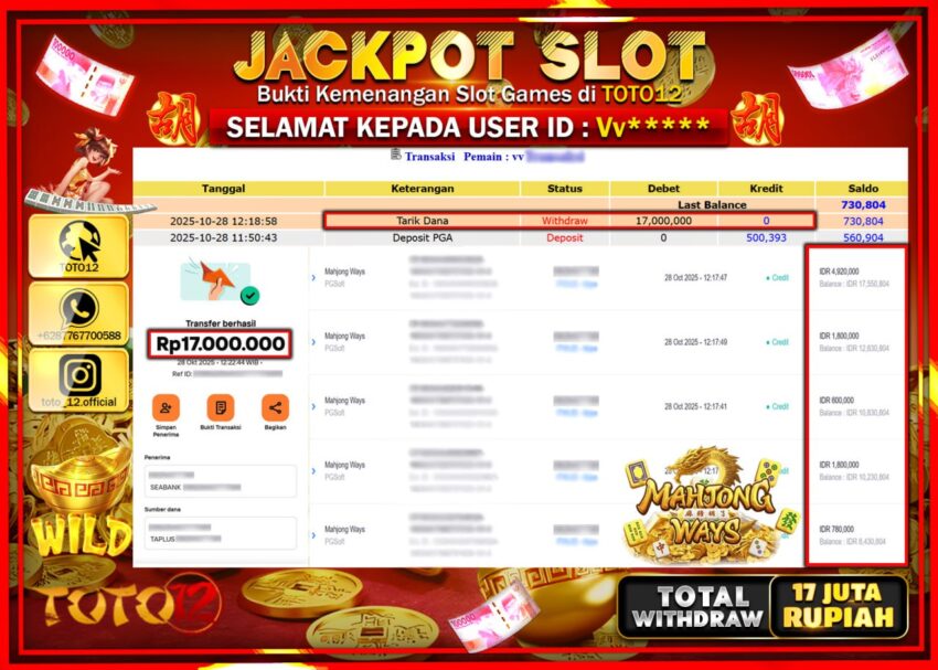 Selamat kepada Member Kami Vv****** Telah Jackpot dan berhasil mendapatkan kemenangan besar pada permainan JACKPOT SLOT GAME (MAHJONG WAYS) Dengan Kemenangan Sebesar Rp.17.000.000 –. Setelah mengisi Fomulir Withdraw dengan Kurang waktu 1-2 Menit Dana sudah kami Trasnfer kepada Pemilik Userid dan dana sudah dapat di cairkan oleh pemenang. Bukti Pembayaran yang TOTO12 berikan merupakan Bukti Pembayaran yang SAH / VALID yang langsung Di dapatkan melalui transaksi dari Bank yang di Tunju.