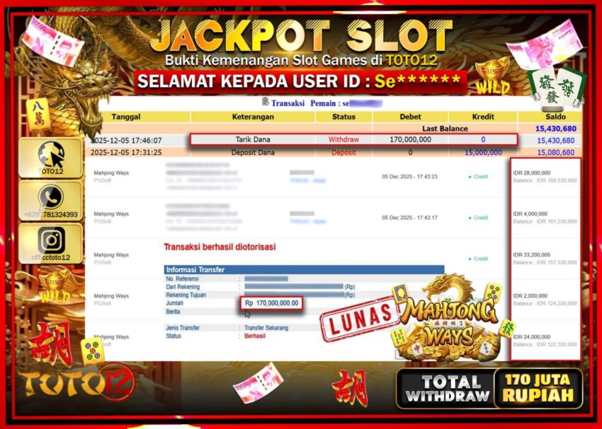 Selamat kepada Member Kami Se****** Telah Jackpot dan berhasil mendapatkan kemenangan besar pada permainan JACKPOT SLOT GAME (MAHJONG WAYS) Dengan Kemenangan Sebesar Rp.170.000.000 –.