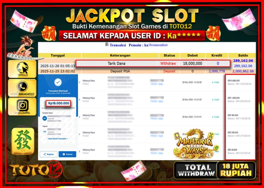 Selamat kepada Member Kami Ka****** Telah Jackpot dan berhasil mendapatkan kemenangan besar pada permainan JACKPOT SLOT GAME (MAHJONG WAYS) Dengan Kemenangan Sebesar Rp.18.000.000 –.