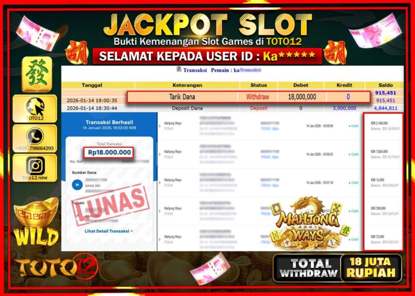 Selamat kepada Member Kami Ka****** Telah Jackpot dan berhasil mendapatkan kemenangan besar pada permainan JACKPOT SLOT GAME (MAHJONG WAYS) Dengan Kemenangan Sebesar Rp.18.000.000 –.