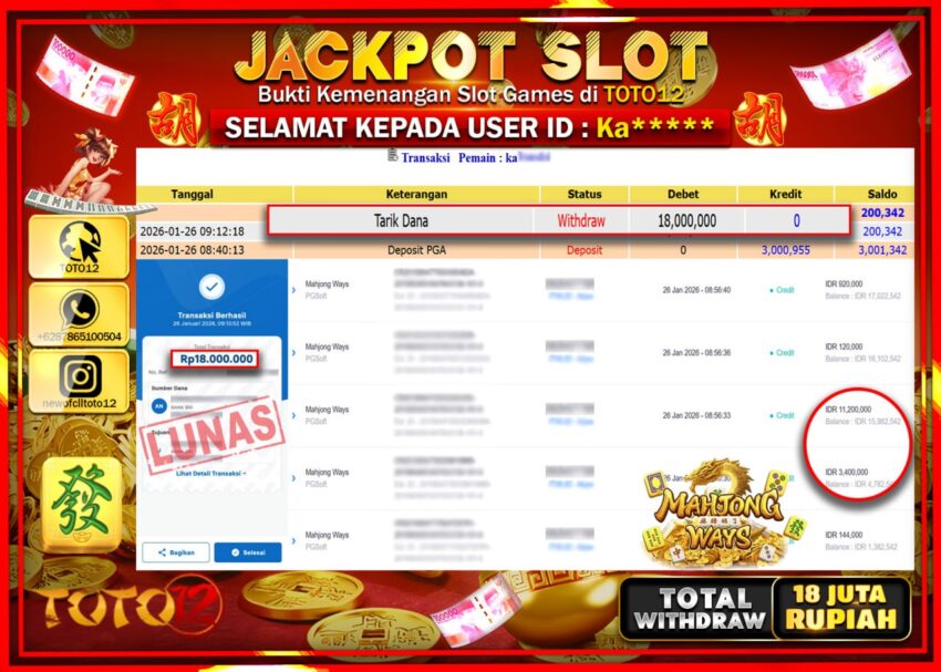Selamat kepada Member Kami Ka****** Telah Jackpot dan berhasil mendapatkan kemenangan besar pada permainan JACKPOT SLOT GAME (MAHJONG WAYS) Dengan Kemenangan Sebesar Rp.18.00.000 –.