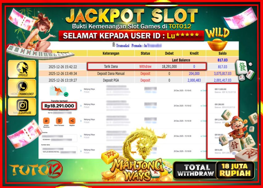 Selamat kepada Member Kami Lu****** Telah Jackpot dan berhasil mendapatkan kemenangan besar pada permainan JACKPOT SLOT GAME (MAHJONG WAYS) Dengan Kemenangan Sebesar Rp.18.291.000 –.