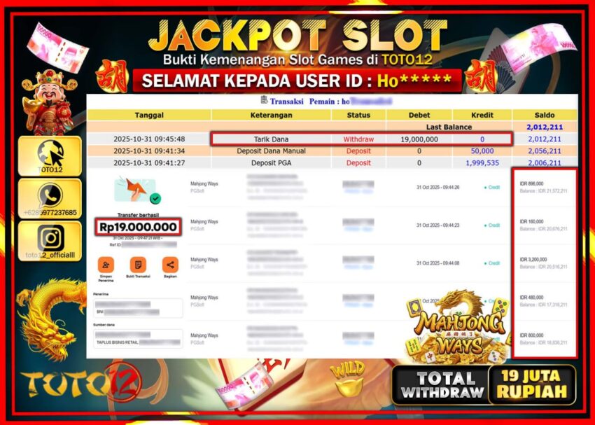 Selamat kepada Member Kami Ho****** Telah Jackpot dan berhasil mendapatkan kemenangan besar pada permainan JACKPOT SLOT GAME (MAHJONG WAYS)  Dengan Kemenangan Sebesar Rp.19.000.000 –.  Setelah mengisi Fomulir Withdraw dengan Kurang waktu 1-2 Menit Dana sudah kami Trasnfer kepada Pemilik Userid dan dana sudah dapat di cairkan oleh pemenang. Bukti Pembayaran yang TOTO12 berikan merupakan Bukti Pembayaran yang  SAH / VALID yang langsung Di dapatkan melalui transaksi dari Bank yang di Tunju.