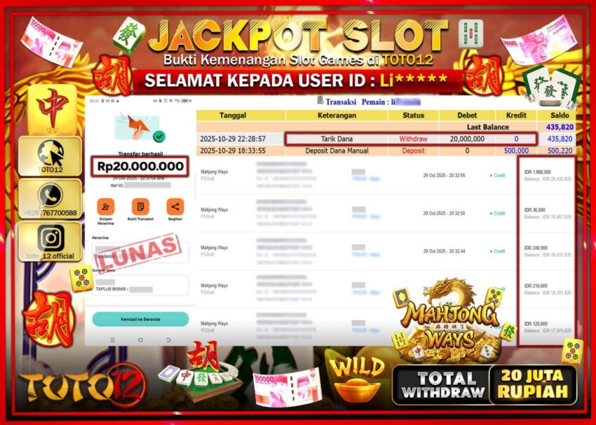Selamat kepada Member Kami Li****** Telah Jackpot dan berhasil mendapatkan kemenangan besar pada permainan JACKPOT SLOT GAME (MAHJONG WAYS) Dengan Kemenangan Sebesar Rp.20.000.000 –. Setelah mengisi Fomulir Withdraw dengan Kurang waktu 1-2 Menit Dana sudah kami Trasnfer kepada Pemilik Userid dan dana sudah dapat di cairkan oleh pemenang. Bukti Pembayaran yang TOTO12 berikan merupakan Bukti Pembayaran yang SAH / VALID yang langsung Di dapatkan melalui transaksi dari Bank yang di Tunju.