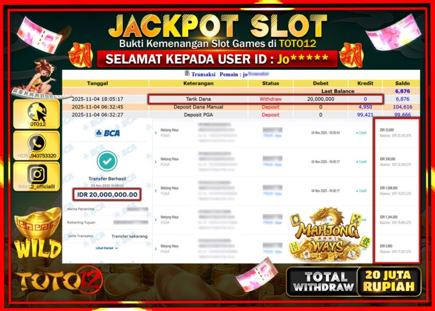 Selamat kepada Member Kami Jo****** Telah Jackpot dan berhasil mendapatkan kemenangan besar pada permainan JACKPOT SLOT GAME (MAHJONG WAYS) Dengan Kemenangan Sebesar Rp.20.000.000 –. Setelah mengisi Fomulir Withdraw dengan Kurang waktu 1-2 Menit Dana sudah kami Trasnfer kepada Pemilik Userid dan dana sudah dapat di cairkan oleh pemenang. Bukti Pembayaran yang TOTO12 berikan merupakan Bukti Pembayaran yang SAH / VALID yang langsung Di dapatkan melalui transaksi dari Bank yang di Tunju.
