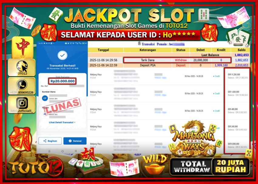 Selamat kepada Member Kami Ho****** Telah Jackpot dan berhasil mendapatkan kemenangan besar pada permainan JACKPOT SLOT GAME (MAHJONG WAYS)  Dengan Kemenangan Sebesar Rp.20.000.000 –.  Setelah mengisi Fomulir Withdraw dengan Kurang waktu 1-2 Menit Dana sudah kami Trasnfer kepada Pemilik Userid dan dana sudah dapat di cairkan oleh pemenang. Bukti Pembayaran yang TOTO12 berikan merupakan Bukti Pembayaran yang  SAH / VALID yang langsung Di dapatkan melalui transaksi dari Bank yang di Tunju.