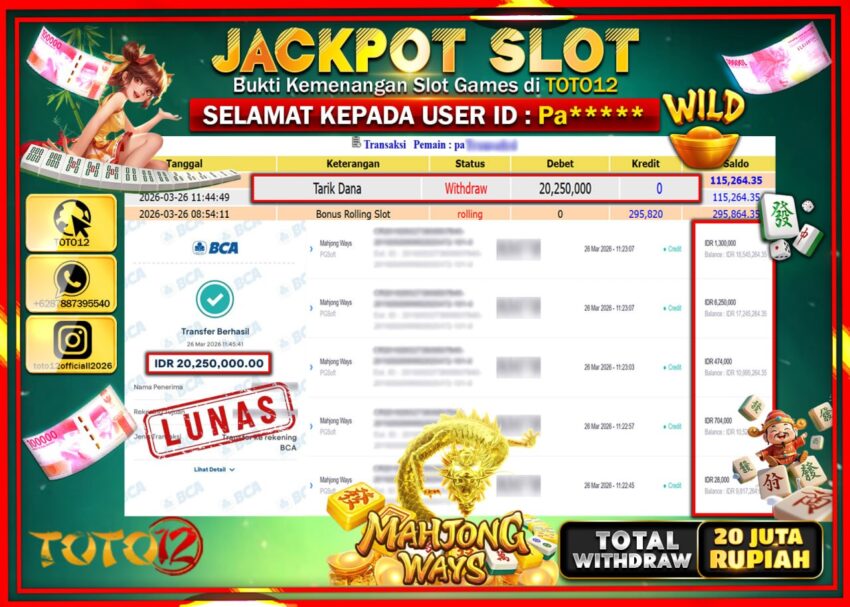 Selamat kepada Member Kami Pa**** Telah Jackpot dan berhasil mendapatkan kemenangan besar pada permainan JACKPOT SLOT GAME (MAHJONG WAYS) Dengan Kemenangan Sebesar Rp.20.250.000–.