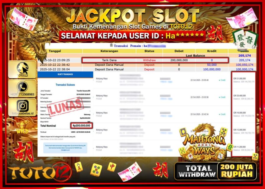Selamat kepada Member Kami Ha****** Telah Jackpot dan berhasil mendapatkan kemenangan besar pada permainan JACKPOT SLOT GAME (MAHJONG WAYS)  Dengan Kemenangan Sebesar Rp.200.000.000 –.  Setelah mengisi Fomulir Withdraw dengan Kurang waktu 1-2 Menit Dana sudah kami Trasnfer kepada Pemilik Userid dan dana sudah dapat di cairkan oleh pemenang. Bukti Pembayaran yang TOTO12 berikan merupakan Bukti Pembayaran yang  SAH / VALID yang langsung Di dapatkan melalui transaksi dari Bank yang di Tunju.