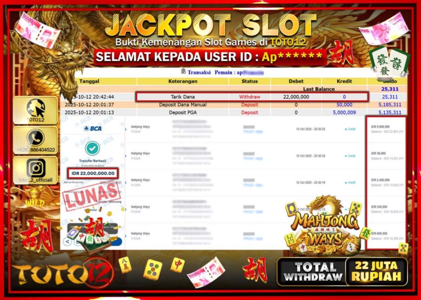 Selamat kepada Member Kami Ap****** Telah Jackpot dan berhasil mendapatkan kemenangan besar pada permainan JACKPOT SLOT GAME (MAHJONG WAYS) Dengan Kemenangan Sebesar Rp.22.000.000 –. Setelah mengisi Fomulir Withdraw dengan Kurang waktu 1-2 Menit Dana sudah kami Trasnfer kepada Pemilik Userid dan dana sudah dapat di cairkan oleh pemenang. Bukti Pembayaran yang TOTO12 berikan merupakan Bukti Pembayaran yang SAH / VALID yang langsung Di dapatkan melalui transaksi dari Bank yang di Tunju.