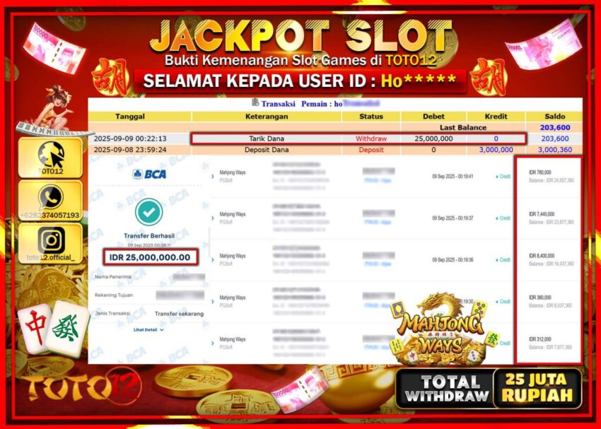 Selamat kepada Member Kami Ho****** Telah Jackpot dan berhasil mendapatkan kemenangan besar pada permainan JACKPOT SLOT GAME (MAHJONG WAYS) Dengan Kemenangan Sebesar Rp.25.000.000 –. Setelah mengisi Fomulir Withdraw dengan Kurang waktu 1-2 Menit Dana sudah kami Trasnfer kepada Pemilik Userid dan dana sudah dapat di cairkan oleh pemenang. Bukti Pembayaran yang TOTO12 berikan merupakan Bukti Pembayaran yang SAH / VALID yang langsung Di dapatkan melalui transaksi dari Bank yang di Tunju.