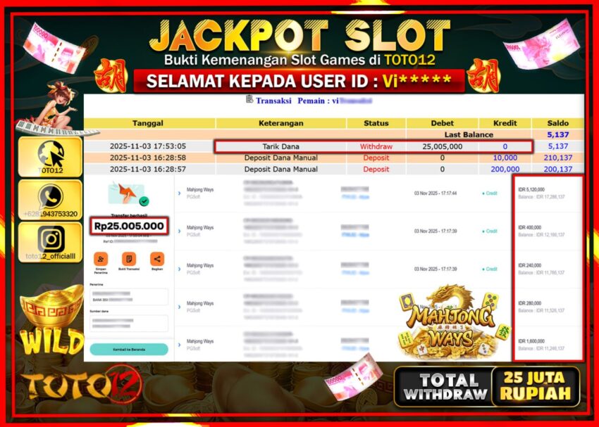 Selamat kepada Member Kami Vi****** Telah Jackpot dan berhasil mendapatkan kemenangan besar pada permainan JACKPOT SLOT GAME (MAHJONG WAYS)  Dengan Kemenangan Sebesar Rp.25.005.000 –.  Setelah mengisi Fomulir Withdraw dengan Kurang waktu 1-2 Menit Dana sudah kami Trasnfer kepada Pemilik Userid dan dana sudah dapat di cairkan oleh pemenang. Bukti Pembayaran yang TOTO12 berikan merupakan Bukti Pembayaran yang  SAH / VALID yang langsung Di dapatkan melalui transaksi dari Bank yang di Tunju.