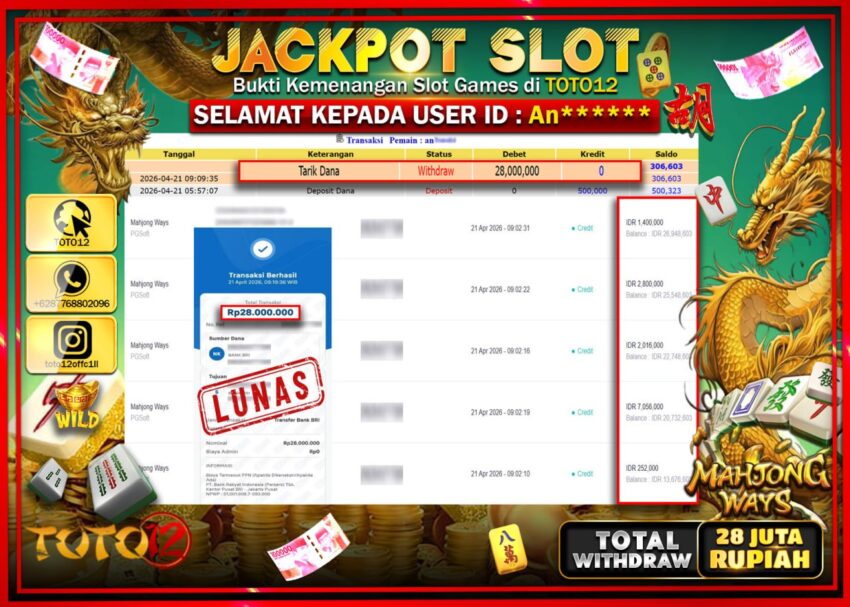 Selamat kepada Member Kami An***** Telah Jackpot dan berhasil mendapatkan kemenangan besar pada permainan JACKPOT SLOT GAME (MAHJONG WAYS) Dengan Kemenangan Sebesar Rp.28.000.000–.