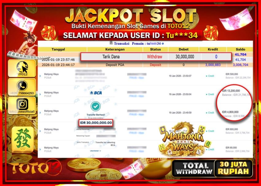 Selamat kepada Member Kami Tu****** Telah Jackpot dan berhasil mendapatkan kemenangan besar pada permainan JACKPOT SLOT GAME (MAHJONG WAYS) Dengan Kemenangan Sebesar Rp.30.000.000 –.