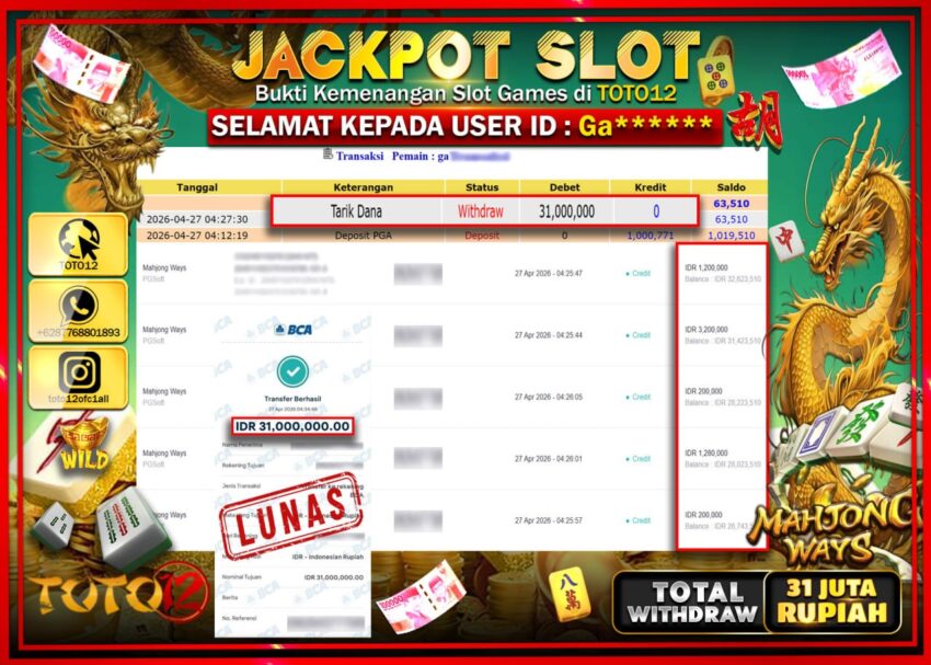 HANYA DI TOTO12 JP PASTI DI BAYAR LUNAS DAN CEPAT!!!!!! JACKPOT SLOT GAME (MAHJONG WAYS) Rp.31.000.000!!!!