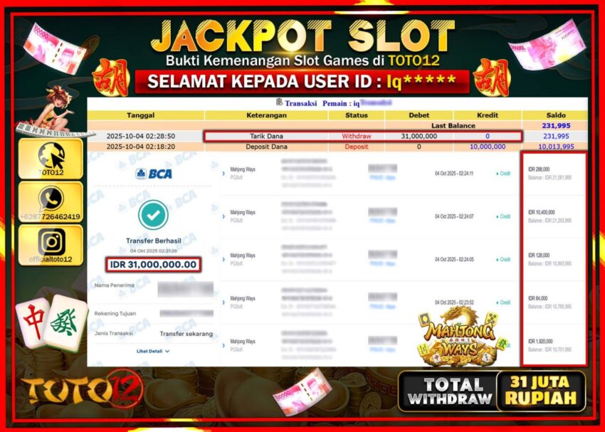 Selamat kepada Member Kami Iq****** Telah Jackpot dan berhasil mendapatkan kemenangan besar pada permainan JACKPOT SLOT GAME (MAHJONG WAYS) Dengan Kemenangan Sebesar Rp.31.000.000 –. Setelah mengisi Fomulir Withdraw dengan Kurang waktu 1-2 Menit Dana sudah kami Trasnfer kepada Pemilik Userid dan dana sudah dapat di cairkan oleh pemenang. Bukti Pembayaran yang TOTO12 berikan merupakan Bukti Pembayaran yang SAH / VALID yang langsung Di dapatkan melalui transaksi dari Bank yang di Tunju.
