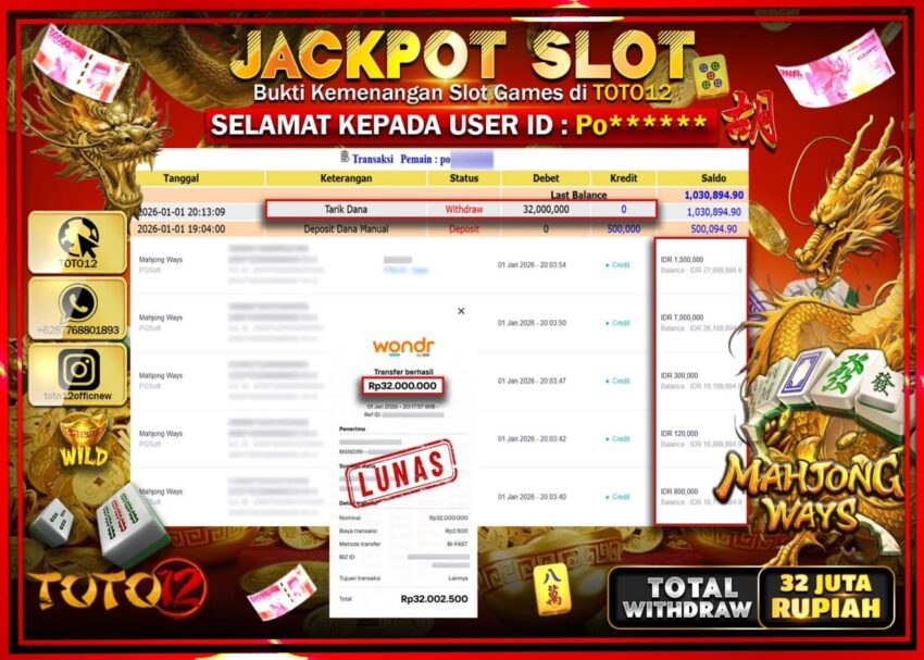 Selamat kepada Member Kami Po****** Telah Jackpot dan berhasil mendapatkan kemenangan besar pada permainan JACKPOT SLOT GAME (MAHJONG WAYS) Dengan Kemenangan Sebesar Rp.32.000.000 –.