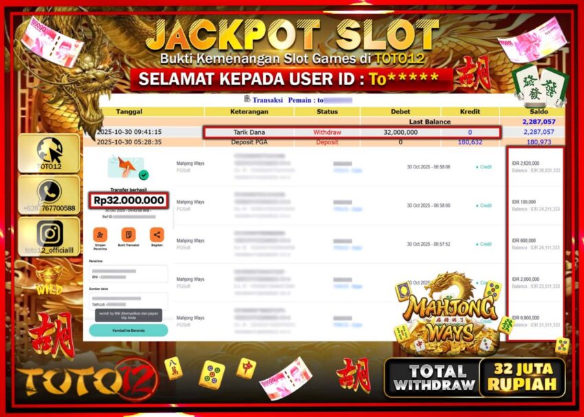 Selamat kepada Member Kami To****** Telah Jackpot dan berhasil mendapatkan kemenangan besar pada permainan JACKPOT SLOT GAME (MAHJONG WAYS)  Dengan Kemenangan Sebesar Rp.32.000.000 –.  Setelah mengisi Fomulir Withdraw dengan Kurang waktu 1-2 Menit Dana sudah kami Trasnfer kepada Pemilik Userid dan dana sudah dapat di cairkan oleh pemenang. Bukti Pembayaran yang TOTO12 berikan merupakan Bukti Pembayaran yang  SAH / VALID yang langsung Di dapatkan melalui transaksi dari Bank yang di Tunju.