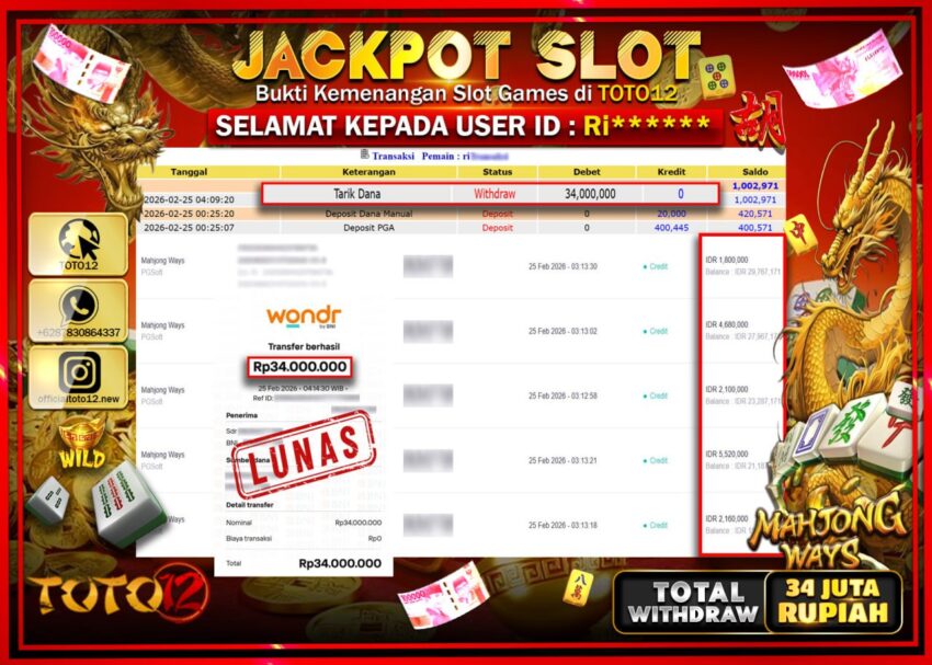 Selamat kepada Member Kami Ri***** Telah Jackpot dan berhasil mendapatkan kemenangan besar pada permainan JACKPOT SLOT GAME (MAHJONG WAYS) Dengan Kemenangan Sebesar Rp.34.000.000–.