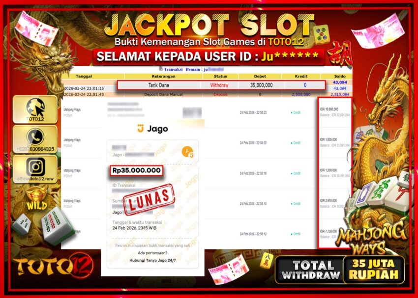Selamat kepada Member Kami Ju***** Telah Jackpot dan berhasil mendapatkan kemenangan besar pada permainan JACKPOT SLOT GAME (MAHJONG WAYS) Dengan Kemenangan Sebesar Rp.35.000.000–.