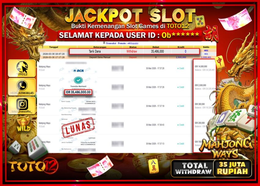 Selamat kepada Member Kami Ob***** Telah Jackpot dan berhasil mendapatkan kemenangan besar pada permainan JACKPOT SLOT GAME (MAHJONG WAYS) Dengan Kemenangan Sebesar Rp.35.486.000–.