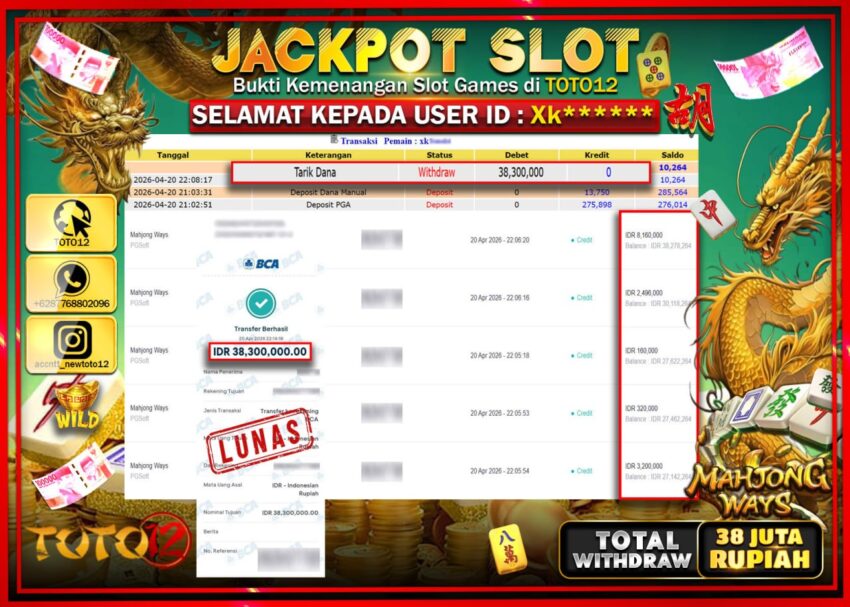 Selamat kepada Member Kami Xk***** Telah Jackpot dan berhasil mendapatkan kemenangan besar pada permainan JACKPOT SLOT GAME  (MAHJONG WAYS)  Dengan Kemenangan Sebesar Rp.38.300.000–.