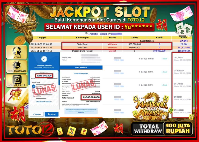 Selamat kepada Member Kami Yu****** Telah Jackpot dan berhasil mendapatkan kemenangan besar pada permainan JACKPOT SLOT GAME (MAHJONG WAYS) Dengan Kemenangan Sebesar Rp.400.000.000 –. Setelah mengisi Fomulir Withdraw dengan Kurang waktu 1-2 Menit Dana sudah kami Trasnfer kepada Pemilik Userid dan dana sudah dapat di cairkan oleh pemenang. Bukti Pembayaran yang TOTO12 berikan merupakan Bukti Pembayaran yang SAH / VALID yang langsung Di dapatkan melalui transaksi dari Bank yang di Tunju.