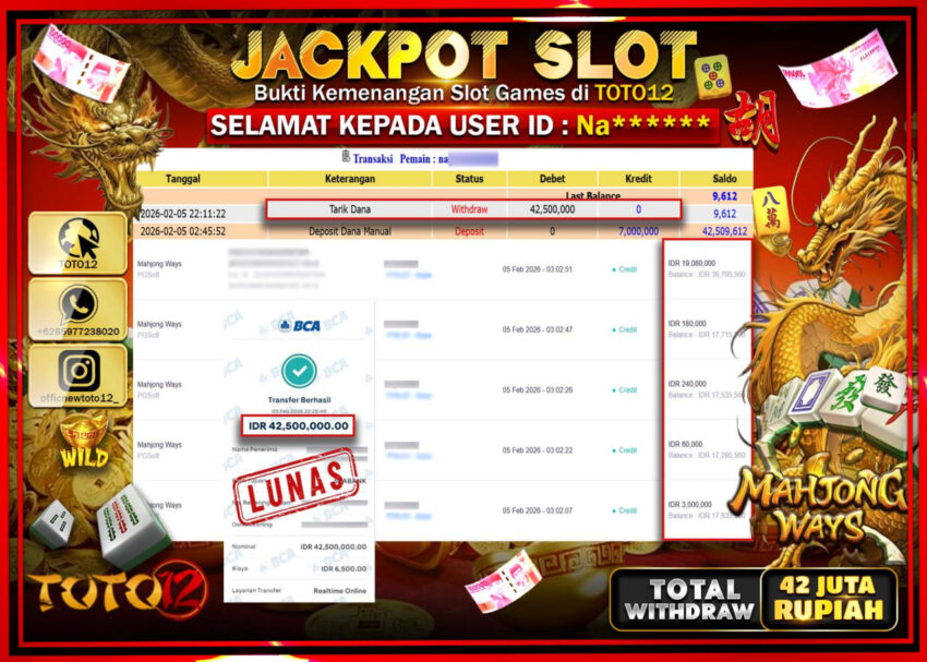 Selamat kepada Member Kami Na****** Telah Jackpot dan berhasil mendapatkan kemenangan besar pada permainan JACKPOT SLOT GAME (MAHJONG WAYS) Dengan Kemenangan Sebesar Rp.42.500.000 –.