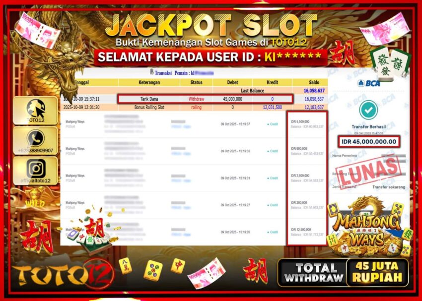 Selamat kepada Member Kami Kl****** Telah Jackpot dan berhasil mendapatkan kemenangan besar pada permainan JACKPOT SLOT GAME (MAHJONG WAYS)  Dengan Kemenangan Sebesar Rp.45.000.000 –.  Setelah mengisi Fomulir Withdraw dengan Kurang waktu 1-2 Menit Dana sudah kami Trasnfer kepada Pemilik Userid dan dana sudah dapat di cairkan oleh pemenang. Bukti Pembayaran yang TOTO12 berikan merupakan Bukti Pembayaran yang  SAH / VALID yang langsung Di dapatkan melalui transaksi dari Bank yang di Tunju.