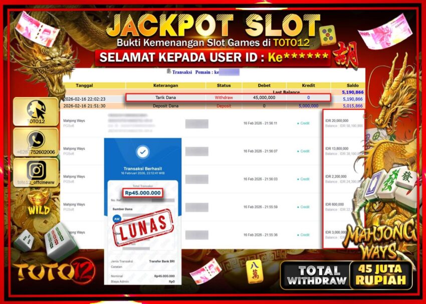 Selamat kepada Member Kami Ke******* Telah Jackpot dan berhasil mendapatkan kemenangan besar pada permainan JACKPOT SLOT GAME (MAHJONG WAYS) Dengan Kemenangan Sebesar Rp.45.000.000–.