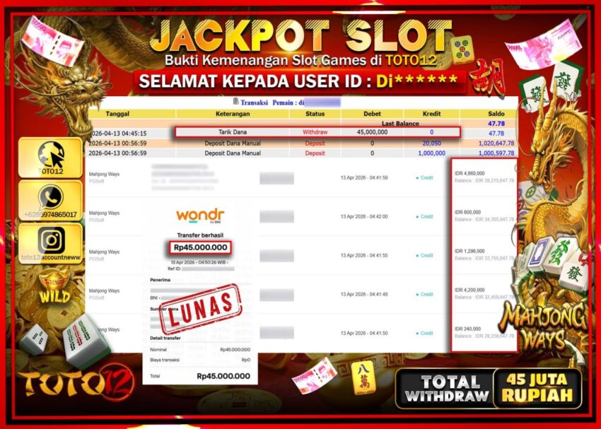 HANYA DI TOTO12 JP PASTI DI BAYAR LUNAS DAN CEPAT!!!!!! JACKPOT SLOT GAME (MAHJONG WAYS) Rp.45.000.000!!!!