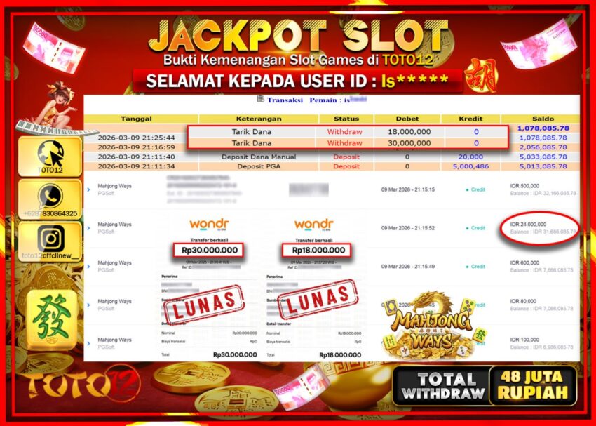 Selamat kepada Member Kami Is**** Telah Jackpot dan berhasil mendapatkan kemenangan besar pada permainan JACKPOT SLOT GAME (MAHJONG WAYS) Dengan Kemenangan Sebesar Rp.48.000.000–.