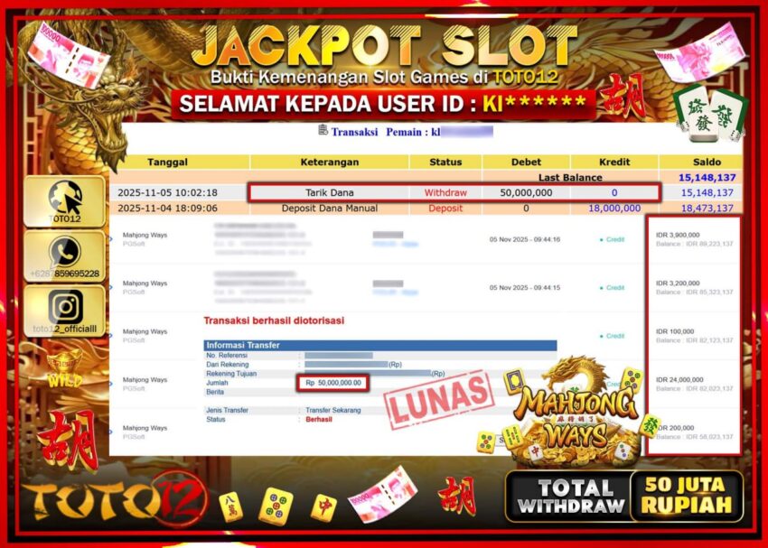 Selamat kepada Member Kami Kl****** Telah Jackpot dan berhasil mendapatkan kemenangan besar pada permainan JACKPOT SLOT GAME (MAHJONG WAYS) Dengan Kemenangan Sebesar Rp.50.000.000 –. Setelah mengisi Fomulir Withdraw dengan Kurang waktu 1-2 Menit Dana sudah kami Trasnfer kepada Pemilik Userid dan dana sudah dapat di cairkan oleh pemenang. Bukti Pembayaran yang TOTO12 berikan merupakan Bukti Pembayaran yang SAH / VALID yang langsung Di dapatkan melalui transaksi dari Bank yang di Tunju.