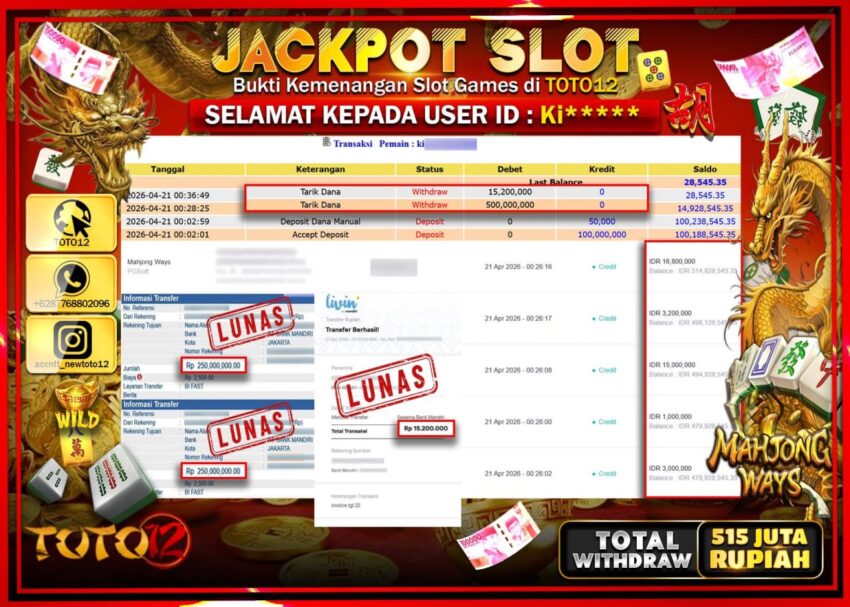 Selamat kepada Member Kami Ki***** Telah Jackpot dan berhasil mendapatkan kemenangan besar pada permainan JACKPOT SLOT GAME (MAHJONG WAYS) Dengan Kemenangan Sebesar Rp.515.200.000–.