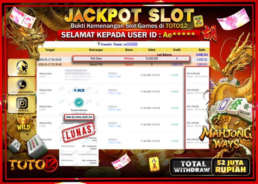 Selamat kepada Member Kami Ae****** Telah Jackpot dan berhasil mendapatkan kemenangan besar pada permainan JACKPOT SLOT GAME (MAHJONG WAYS) Dengan Kemenangan Sebesar Rp.52.000.000 –.