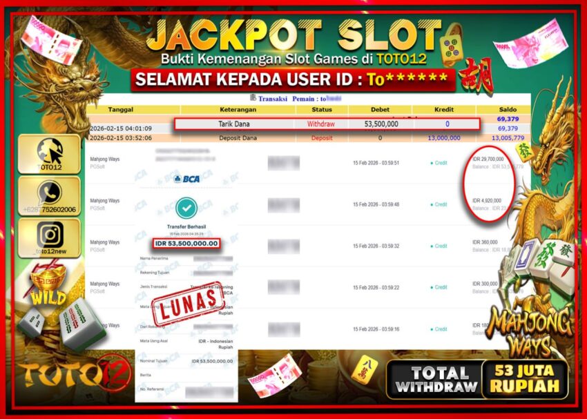Selamat kepada Member Kami To******  Telah Jackpot dan berhasil mendapatkan kemenangan besar pada permainan JACKPOT SLOT GAME  (MAHJONG WAYS)  Dengan Kemenangan Sebesar Rp.53.500.000–.