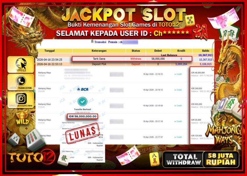 • HANYA DI TOTO12 JP PASTI DI BAYAR LUNAS DAN CEPAT!!!!!! JACKPOT SLOT GAME (MAHJONG WAYS) Rp.58.000.000!!!!