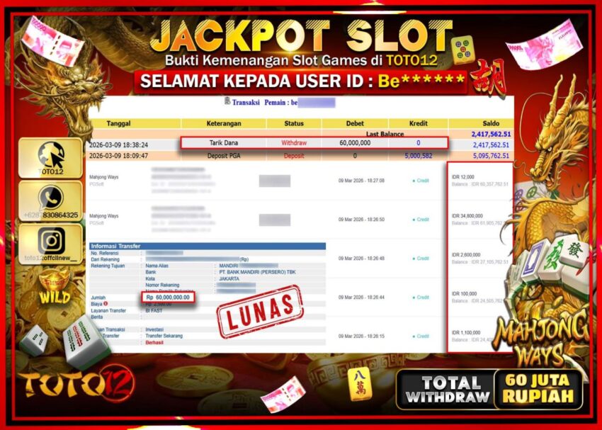 Selamat kepada Member Kami Be**** Telah Jackpot dan berhasil mendapatkan kemenangan besar pada permainan JACKPOT SLOT GAME (MAHJONG WAYS) Dengan Kemenangan Sebesar Rp.60.000.000–.
