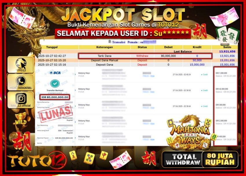 Selamat kepada Member Kami Su****** Telah Jackpot dan berhasil mendapatkan kemenangan besar pada permainan JACKPOT SLOT GAME (MAHJONG WAYS) Dengan Kemenangan Sebesar Rp.80.000.000 –. Setelah mengisi Fomulir Withdraw dengan Kurang waktu 1-2 Menit Dana sudah kami Trasnfer kepada Pemilik Userid dan dana sudah dapat di cairkan oleh pemenang. Bukti Pembayaran yang TOTO12 berikan merupakan Bukti Pembayaran yang SAH / VALID yang langsung Di dapatkan melalui transaksi dari Bank yang di Tunju.